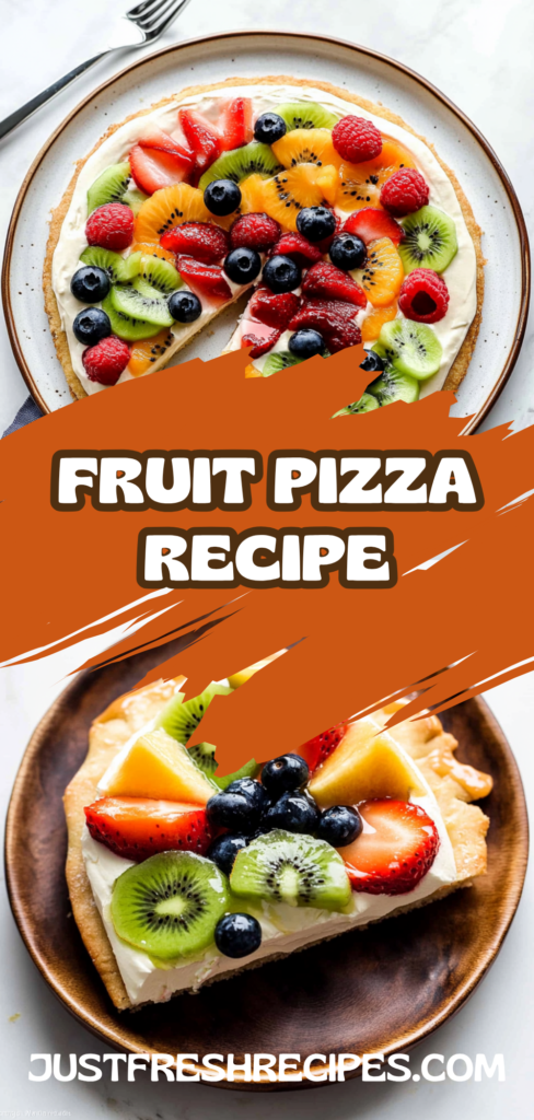 Imagine a delightful fruit pizza recipe where a buttery, soft cookie base cradles a luscious layer of creamy frosting, all topped with vibrant, fresh fruits. The colorful medley of strawberries, kiwi, and blueberries invites you to indulge in a refreshing and visually stunning treat perfect for any occasion.