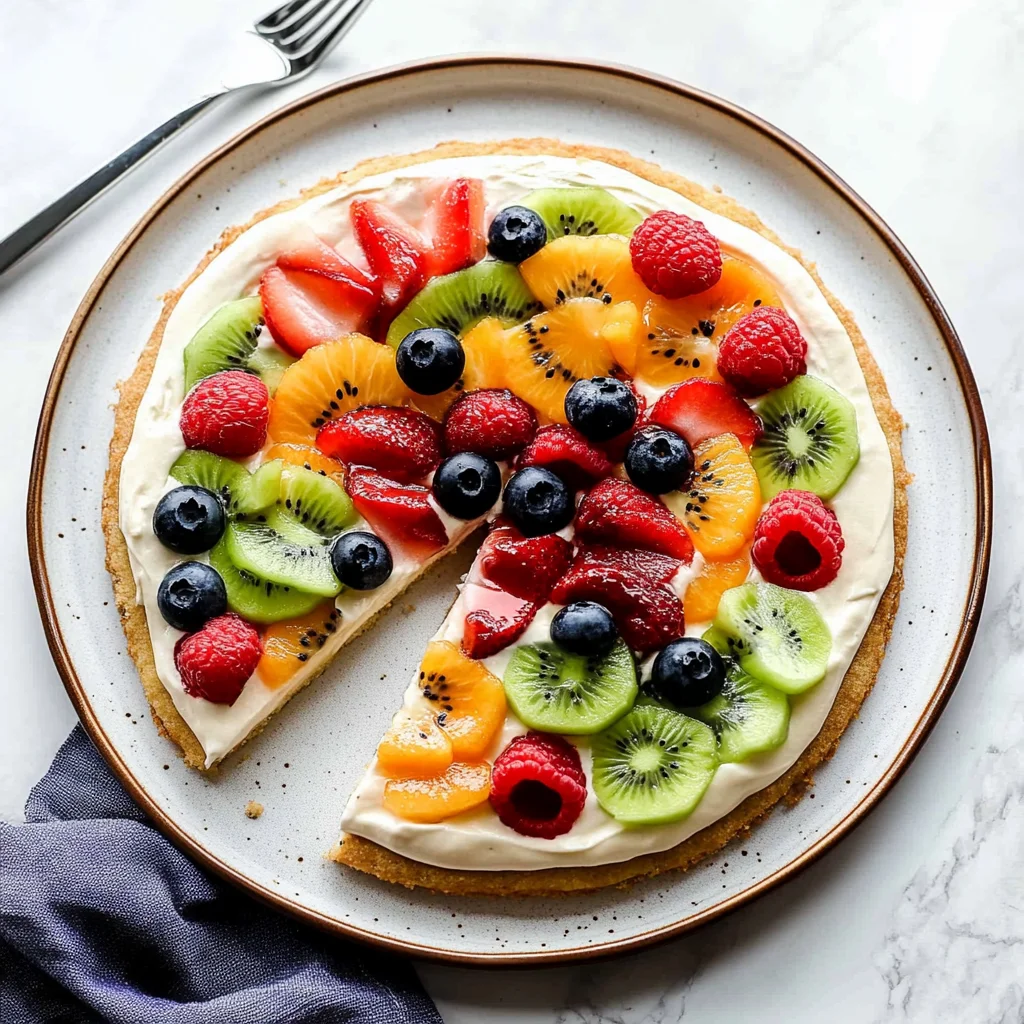 A delightful dessert pizza topped with a creamy frosting and an array of fresh fruits, perfect for summer gatherings or special occasions.